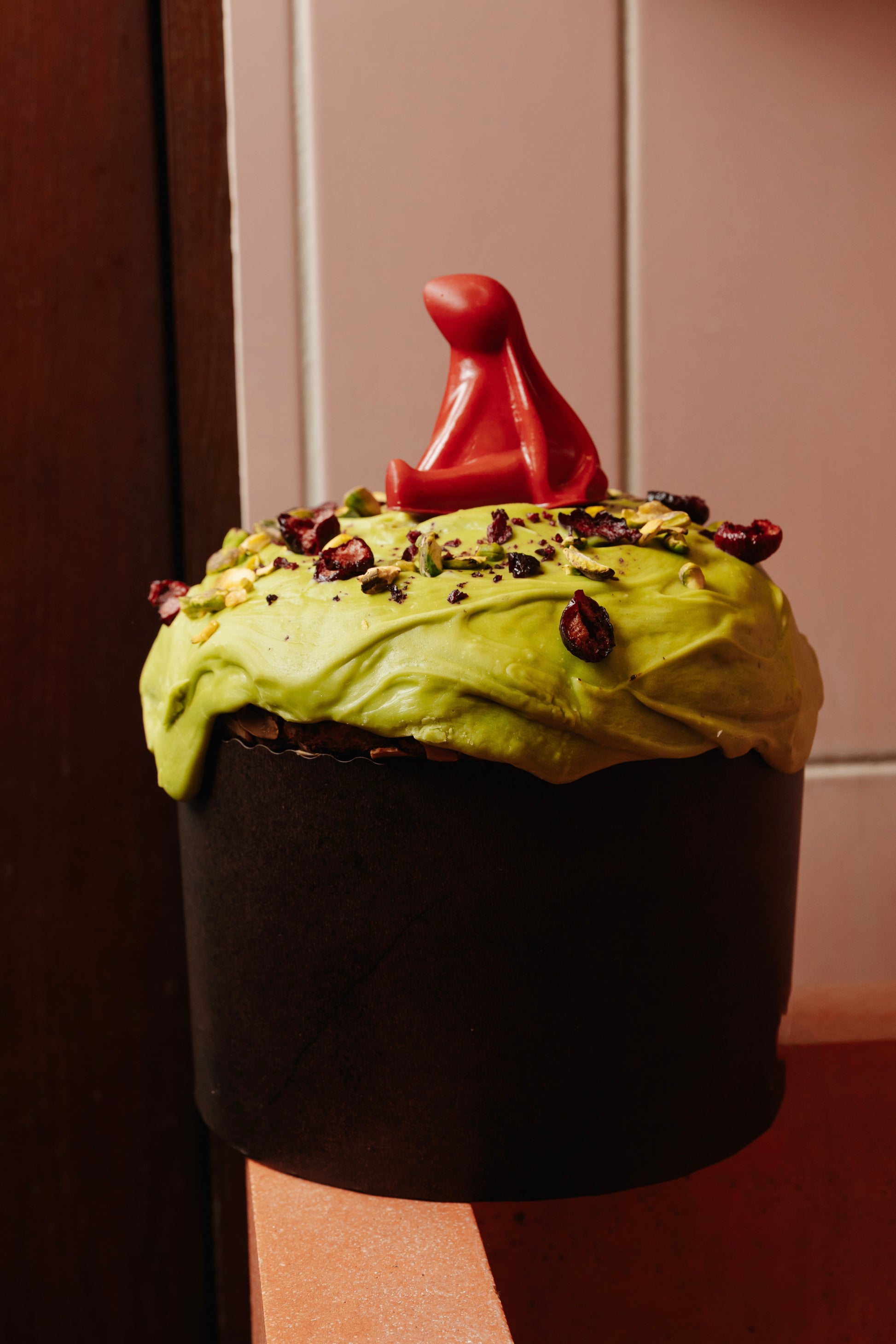 Ароматна паска на жовтках з апельсиновою нотою. Серединку наповнюємо фісташковим кремом, вершками та соковитою вишнею. А зверху – фігурка з білого шоколаду, згущеного молока та сублімованої вишні. Той самий улюблений смак, тільки в святковому форматі.