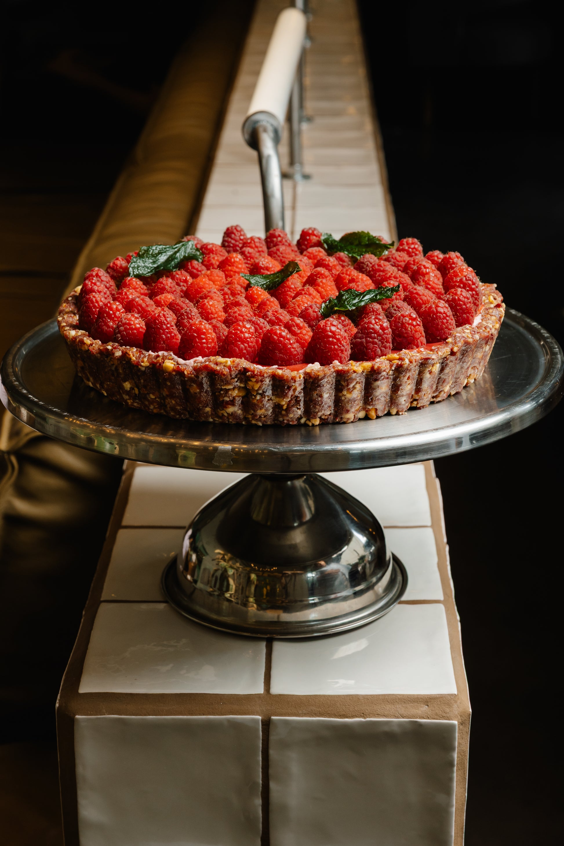 З начинкою зі згущеного молока та крем-сиру, вершків, та полуничного кулі, на основі з мигдалю та журавлини з кокосовим маслом.